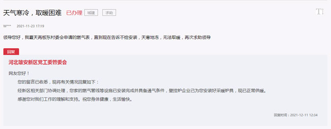 家住雄縣米家務鎮坂東村的胡先生也遇到了關于取暖的煩惱!拔胰ツ晗奶毂阆蜊鄸|村委會申請了燃氣表,但是到供暖季了,燃氣表還沒有裝好!睙o奈之下胡先生在人民網“領導留言板”留言尋求解決。雄安新區黨工委、管委會在接到訴求后,立即協調進行處理。經查,胡先生家的燃氣管線等設施已安裝完成并具備通氣條件,于是又協調壁掛爐企業對其進行采暖爐具的安裝。