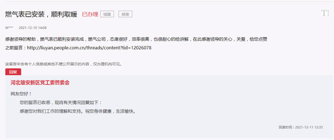 “燃氣表已順利安裝完成,燃氣公司態度很好,效率很高,也很耐心的給講解,在此感謝領導的關心,關愛,給您點贊!眴栴}解決后,胡先生高興地留言感謝。