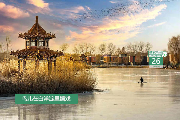今天是2022年1月26日,星期三,天氣陰,-5℃~3℃。在封面和大家見面的是在白洋淀里嬉戲的鳥兒。