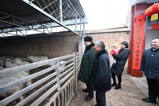 臨近春節,蔡文明家的院子很喜慶。大大的“!弊仲N在五間平房的正對面,小年剛過,紅紅的手寫對聯也已經貼上!昂湍兰覒c福澤長,勤奮兒女財源盛”,橫批是“太平盛世”?倳涀钕冗M入了最右側的廚房,籮筐里有紅燒肉、丸子、麻葉,到了灶臺邊,蔡文明掀開了鍋蓋,里面正燉著熱氣騰騰的羊肉。灶臺邊上,幾排當地的油糕已做好,蔡文明說:“總書記問我油糕是什么面做的,我回答說是‘軟米面’,總書記又問我是不是糜子面,我后來才反應過來回答是的?倳浱r村的生活了!”