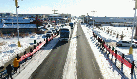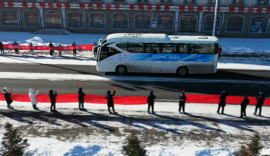 載有27名冬季兩項國家隊運動員和相關工作人員的大巴車及保障車輛緩緩駛出訓練基地,由承德市御道口牧場管理區奔赴張家口崇禮冬奧賽場。當地群眾打起橫幅,揮舞小國旗沿路送行,寄托對北京冬奧會的祝福,為中國運動員鼓勁加油。