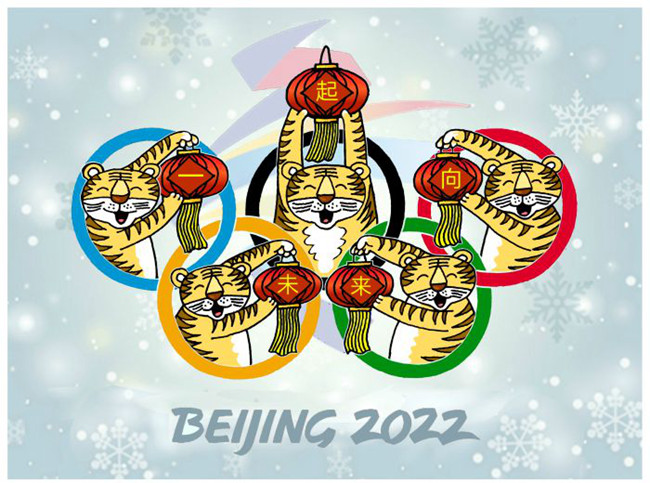 去年7月,國際奧委會第138次全會經投票表決后,同意在“更快、更高、更強”的奧林匹克格言后加入“更團結”。而對于中國人來說,春節就意味著團圓!皥F結”和“團圓”在這個冬天有了共同的內涵。漫畫家王真的作品《真誠祝!,五虎在五環的映襯下,手持紅燈籠,大聲喊出北京冬奧會主題口號:一起向未來!