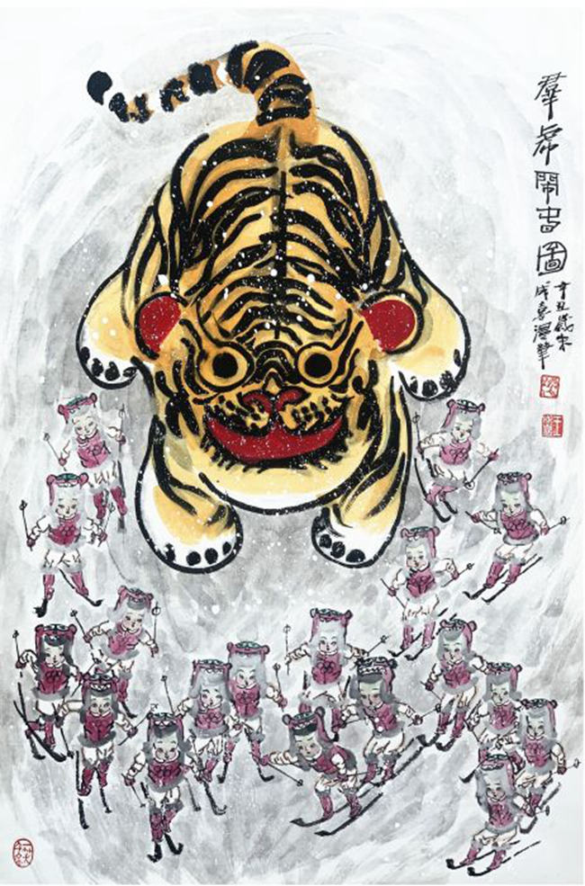漫畫家朱晉的作品《五“!迸R門鬧新春》,讓虎年的主角—老虎親自上陣體驗冰雪運動之樂。