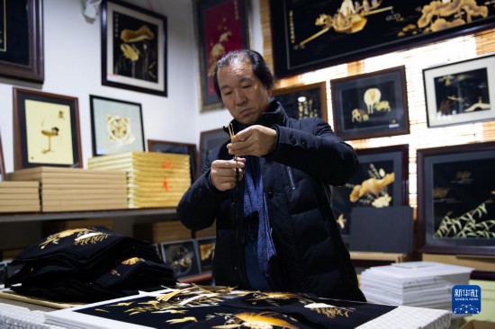 河北省非物質文化遺產蘆葦畫技藝傳承人楊丙軍在制作蘆葦畫(2019年1月8日攝)。新華社發(王京卓 攝)