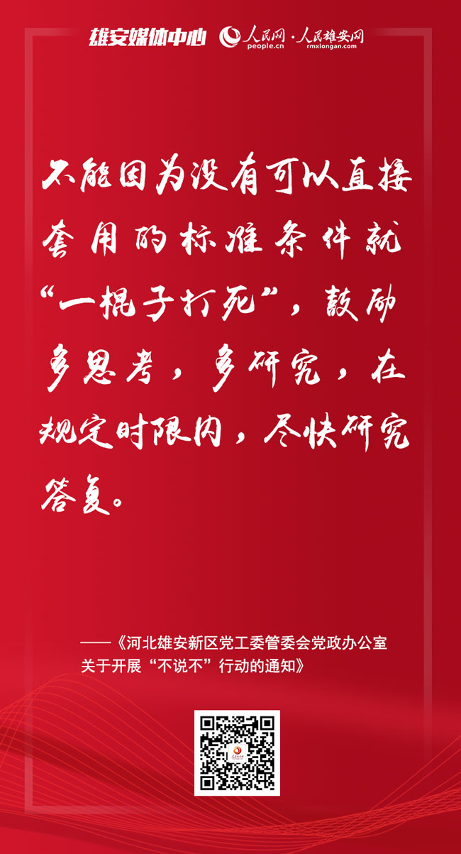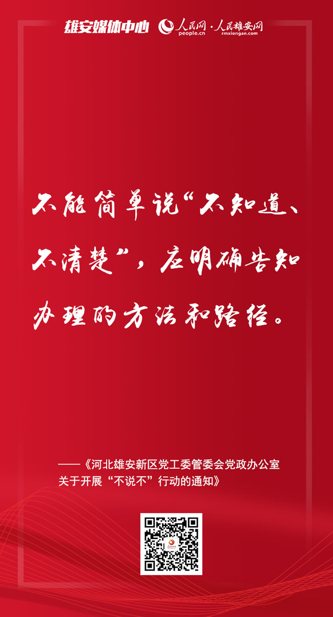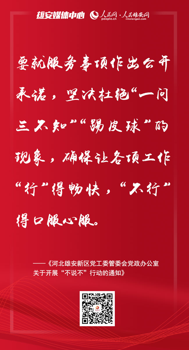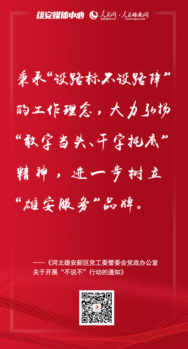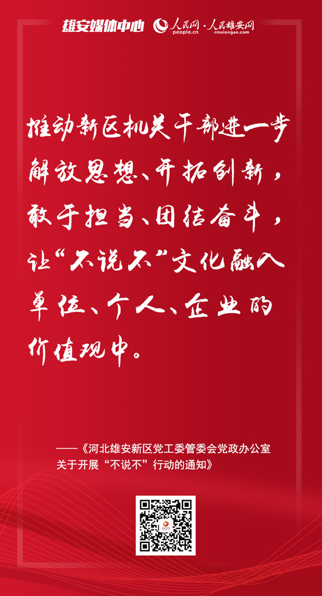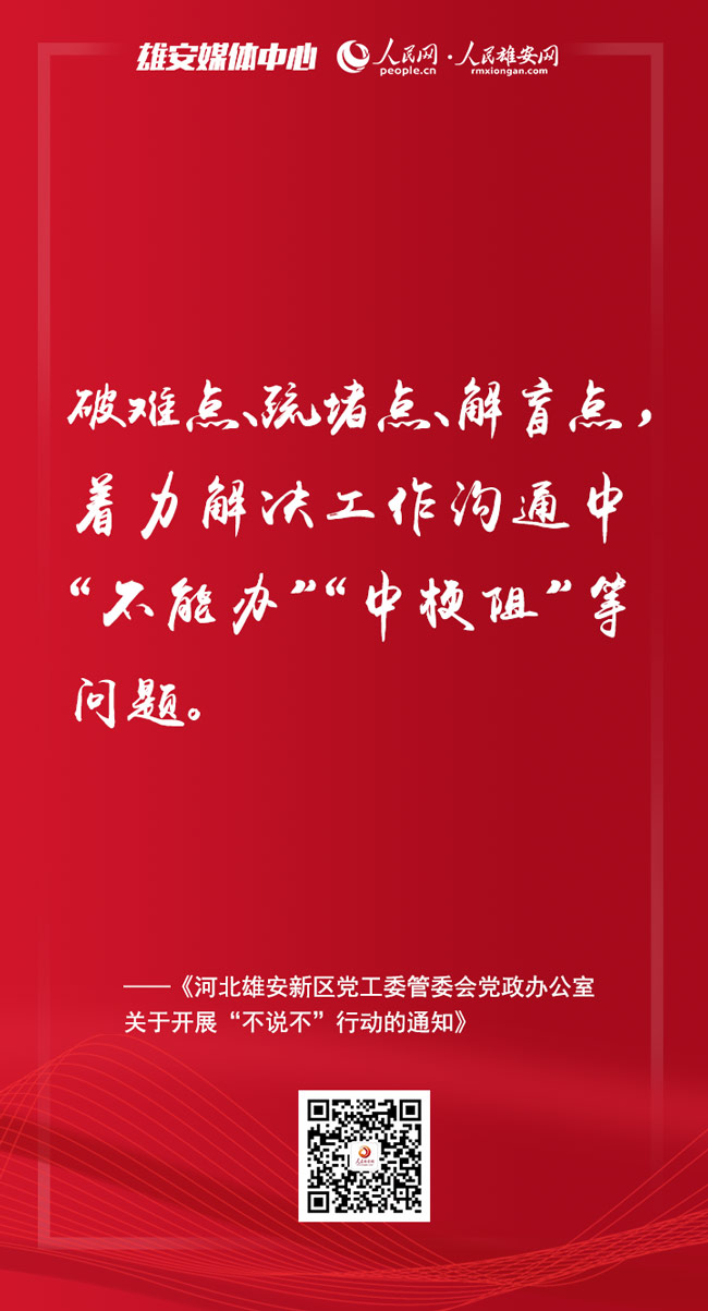 人民網雄安2月11日電 日前召開的雄安新區進一步加強作風建設大會上,印發了《河北雄安新區黨工委管委會黨政辦公室關于開展“不說不”行動的通知》,提出要在新區范圍內開展“不說不”行動。人民雄安網為你梳理了要點,一起來看。