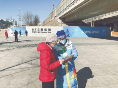 2月3日上午,在清河火車站外的北京2022年冬奧會志愿服務點位,身穿藍色志愿者服裝的尹征忙碌的身影格外亮眼。他正拿著觀賽指南宣傳單頁,耐心地向游客介紹著冬奧會賽程安排。