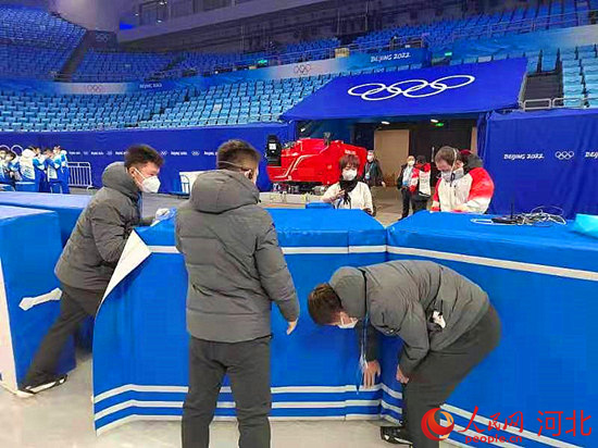 工作人員正在比賽場地安裝防護墊。 楊計軍供圖