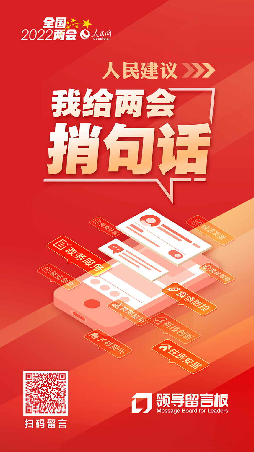 2022年全國兩會將于3月召開,日前,人民網“2022年我給兩會捎句話”活動已經正式啟動,面向社會各界征集建議。關于各地如何抓好政府工作報告的事項落實,如何更好實施“十四五”規劃,您有什么“好主意”“金點子”?歡迎到“捎句話”活動里提出您的建議,為家鄉的繁榮與國家的發展建言獻策。
