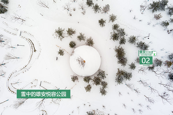 今天是2022年3月2日,星期三,天氣晴,-4℃~16℃。在封面和大家見面的是雪中的雄安悅容公園。