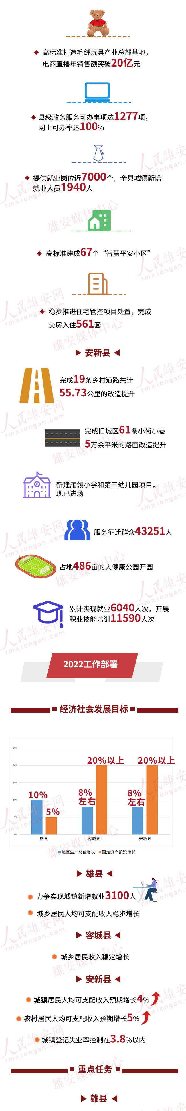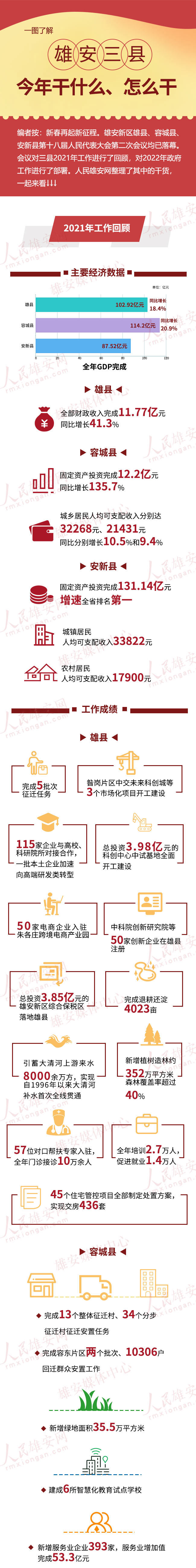 人民網雄安3月3日電 (李雪晴 何美萱)新春再起新征程。雄安新區雄縣、容城縣、安新縣第十八屆人民代表大會第二次會議均已結束。會議對三縣2021年工作進行了回顧,對2022年政府工作進行了部署。人民雄安網整理了其中的干貨↓↓↓