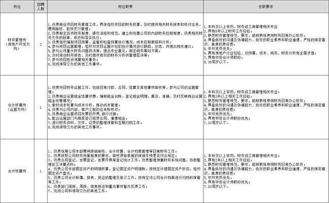 公告顯示,此次招聘財務管理崗(房地產開發方向)2人,會計核算崗(運營方向)1人,會計核算崗1人。應聘者需本科及以上學歷,30及35周歲以下即可報名。本次報名僅接受網上報名。
