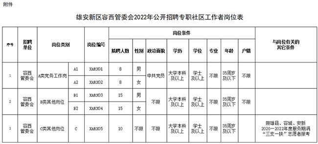 附件:雄安新區容西管委會2022年公開招聘專職社區工作者崗位表
