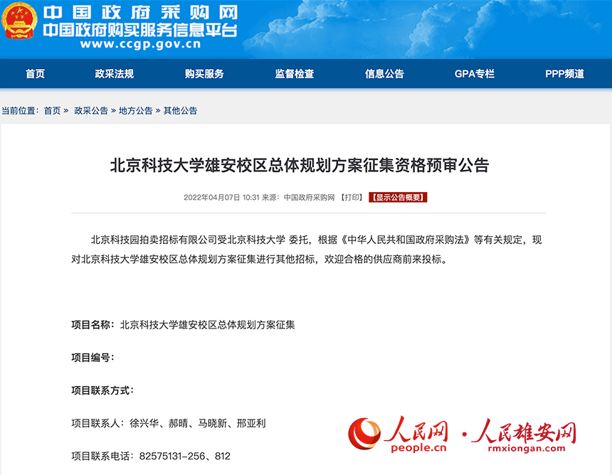 這是從中國政府采購網發布的《北京科技大學雄安校區總體規劃方案征集資格預審公告》(下稱“公告”)獲悉的。根據公告,“北京科技大學雄安校區總體規劃方案征集”活動,擬公開邀請國內外具有相關經驗的規劃設計機構前來申請應征,提交資格預審申請文件。通過資格預審選取不超過7個應征人參加征集活動,并提交應征規劃設計方案。