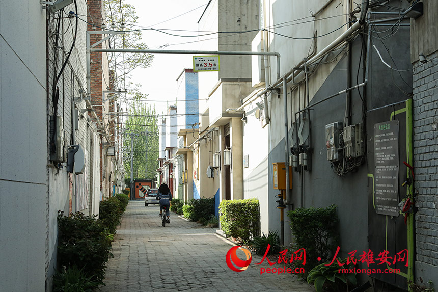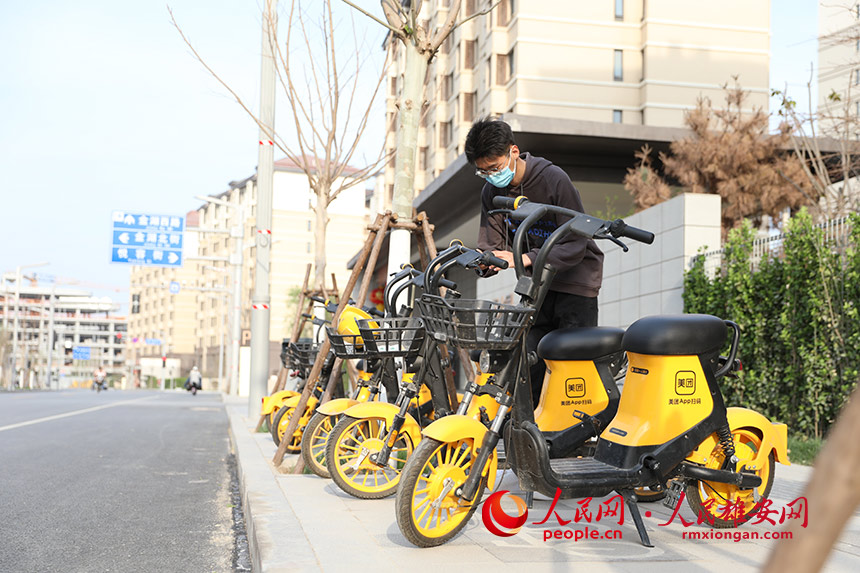 居民掃碼騎行共享單車,為實現雄安新區“90/80”綠色出行目標盡一份力。人民網 宋燁文攝