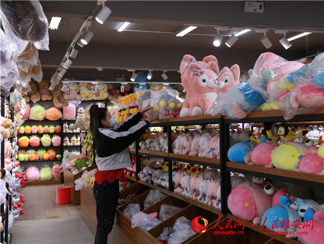 容城縣毛絨玩具城內,工作人員正在整理毛絨玩具。人民網 李雪晴攝