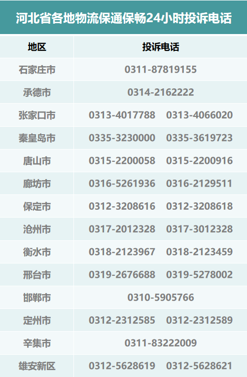 3.河北省交通運輸廳對外公布各地物流保通保暢24小時投訴電話。