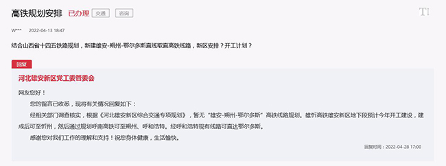 收到網友留言后,雄安新區黨工委管委會安排了相關部門進行調查核實,并回復稱:根據《河北雄安新區綜合交通專項規劃》,暫無“雄安—朔州—鄂爾多斯”高鐵線路規劃,但雄忻高鐵雄安新區地下段預計今年開工建設,建成后可至山西忻州,然后通過規劃呼南高鐵可至朔州、呼和浩特,經呼和浩特現有線路可直達鄂爾多斯。