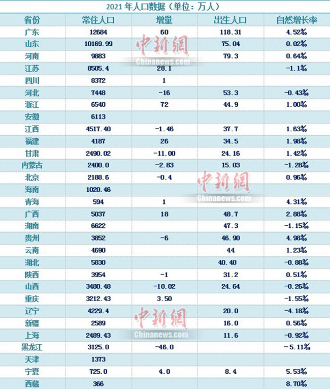 3、國家統計局數據顯示,2021年末全國人口141260萬人,比上年末僅增加48萬人。從公開人口變動情況的省份來看,黑龍江、河北、甘肅、內蒙古、北京、貴州、陜西、山西、江西等地常住人口有所減少;從出生人口來看,中國第一人口大省廣東占據第一的位置;從常住人口的增量來看,占據第一的是浙江。