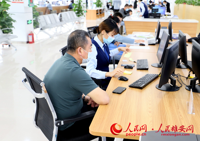 雄縣政務服務中心幫辦人員為辦事群眾填寫信息。人民網 劉師豪攝