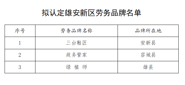 根據《關于開展2022年河北雄安新區勞務品牌推薦認定工作的通知》(雄安公服發﹝2022﹞47號)要求,經品牌自主申報、縣級推薦、專家評審,擬認定三臺鞋匠等3個勞務品牌為雄安新區勞務品牌,現予以公示。公示期為2022年5月26日至5月30日。