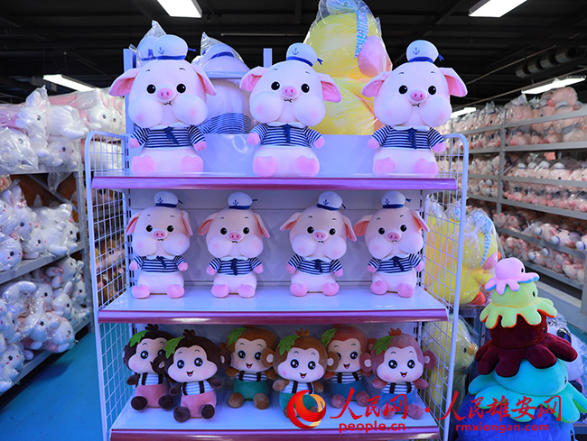 圖為商家正在封裝毛絨玩具。人民網 王紅攝