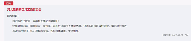 收到留言后,雄安新區黨工委管委會回復稱,經雄縣相關部門調查核實,當地正積極協調相關補償費用,預計5月內可撥付到位。