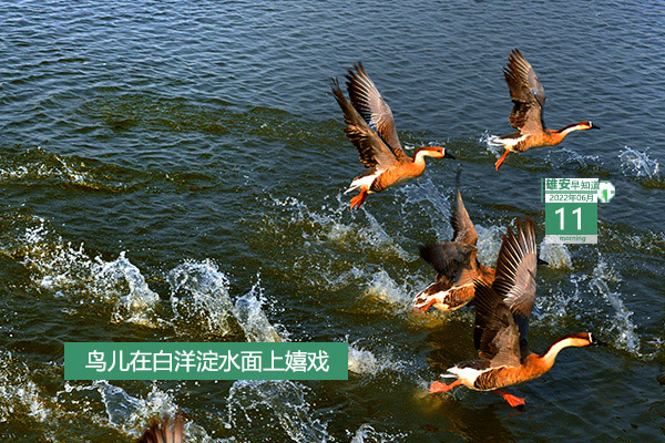 今天是2022年6月11日,星期六,天氣雷陣雨轉中雨 ,20~31℃。在封面和大家見面的是鳥兒在白洋淀嬉戲的景象。