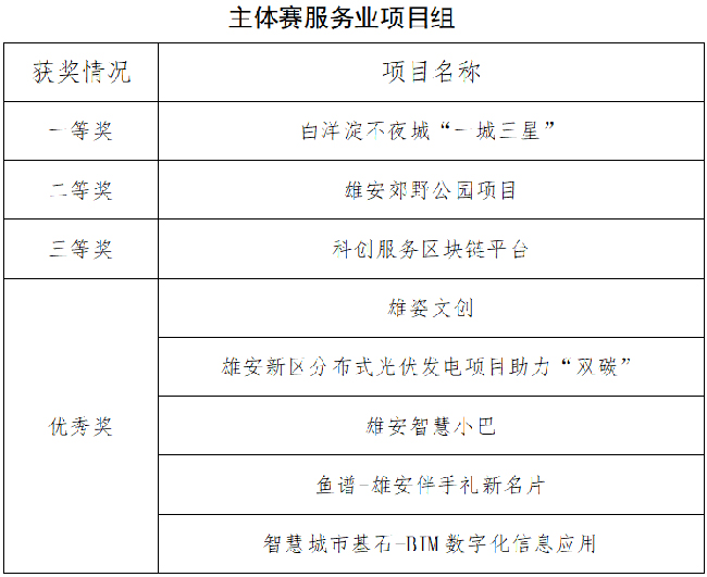 決賽主體賽和專項賽各項目組分別評選出一等獎1名,二等獎1名, 三等獎1名,優秀獎5名。獲獎項目將被授予“雄安新區優秀創業創新項目”稱號,并在積分落戶、創業擔保貸款申請等方面獲得政策支持。