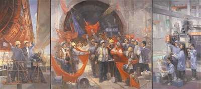 有的美術工作者借助全景式的描繪,彰顯大型基礎設施為城市發展帶來的活力。像孔凡博油畫《遠航》,以三聯畫的形式,藝術再現了上海自由貿易試驗區的繁榮景象。畫面中心是忙碌的碼頭、海上來往的貨輪,遠處高樓大廈鱗次櫛比,視野開闊,場面宏大;兩側分別描繪了上海外灘風貌和港口作業狀態。放眼望去,集裝箱、橋吊、門吊歷歷可辨,細節刻畫真實生動,深刻闡釋了以高水平開放促進高質量發展中,自由貿易試驗區所發揮的獨特作用。
