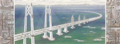 有的美術工作者以跨時空的表達,凸顯大型基礎設施建設的重大意義。李翔、楊文森、張蕊、張慶軍合作的中國畫《大灣騰巨龍》,以世界上最長的橋隧組合跨海通道——港珠澳大橋為對象,直觀表現了港珠澳大橋對粵港澳三地的銜接功能。畫面中心,港珠澳大橋宛若游龍,蜿蜒伸向遠方,優美而富有抒情意味;畫面遠方,群山起伏、樓群高低錯落,在大橋連接下與近景形成呼應,構成完整敘事。畫面左右兩側,細致勾勒了港珠澳大橋的建設場景,頗具歷史縱深感,豐富了畫面的視角與層次。透過作品,觀眾不難感受到粵港澳大灣區發展的新氣象。