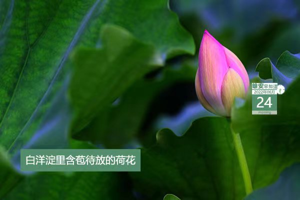 今天是2022年6月24日,星期五,天氣晴轉多云,22℃~39℃。在封面和大家見面的是白洋淀里含苞待放的荷花。