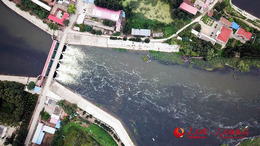 圖為趙王新河治理工程(雄縣段)上游正在泄水的棗林莊樞紐4孔閘。人民網?宋燁文攝