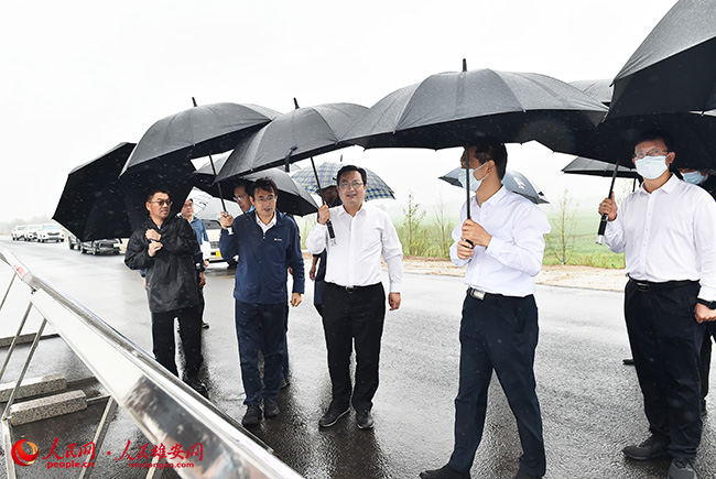張國華冒雨來到南拒馬河右堤工程建設現場,實地察看堤防工程、河道險工治理等進展情況,聽取防汛備汛工作情況匯報。他強調,雄安新區已經進入為期一個月的主汛期,各級各部門務必進一步提高政治站位,樹牢底線思維,以“時時放心不下”的責任感抓實抓細防汛備汛各項工作。要強化工程質量和安全生產監督管理,穩步推進南拒馬河右堤防洪治理工程生態堤項目建設,努力做到防洪設施建設與生態環境保護相結合,防洪效益與生態效益有機統一。要認真做好河道堤防、閘涵泵站、險工險段等重點部位防范,扎實開展隱患排查整治,確保安全度汛。要密切監測跟蹤天氣、雨情、水情和汛情變化,加強與上下游有關縣市溝通交流,科學精準研判汛情發展趨勢,及時研究采取應對措施。要充分發揮新區、縣、鄉、村四級應急指揮體系作用,合理有效協調各方資源和力量,確保新區防御資源實現最優配置、防御能力發揮最大作用。要切實抓好防汛責任落實,嚴格執行24小時值班和領導帶班制度,及時掌握汛情、險情、災情,堅決做到早發現、早報告、早處置。