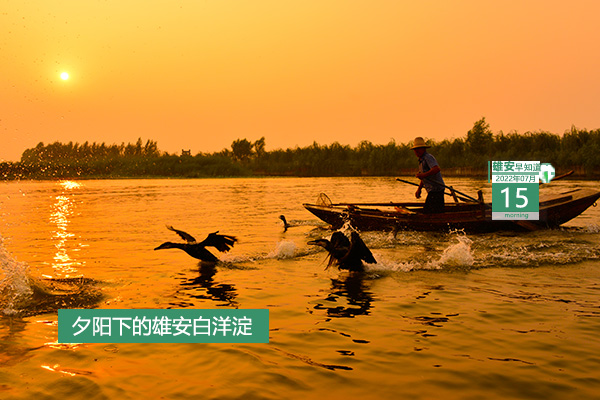 今天是2022年7月15日,星期五,天氣晴,23℃~36℃。在封面和大家見面的是夕陽下的雄安白洋淀。