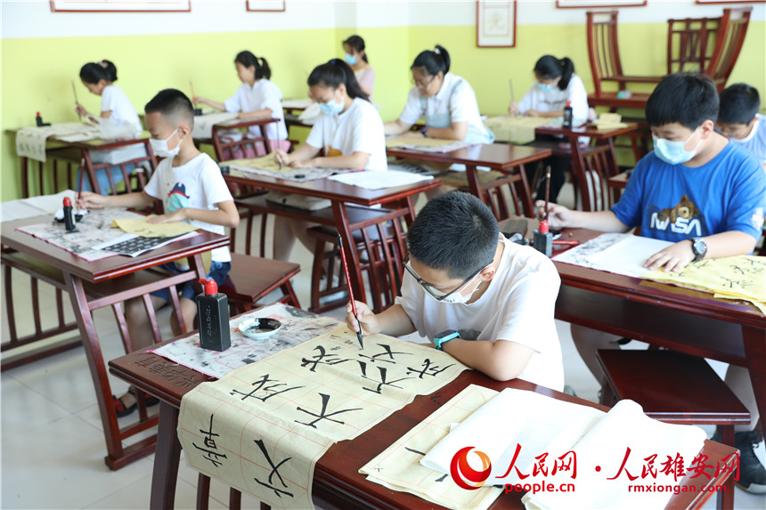 容城縣青少年活動中心內,孩子們在上書法課。人民網 王紅攝