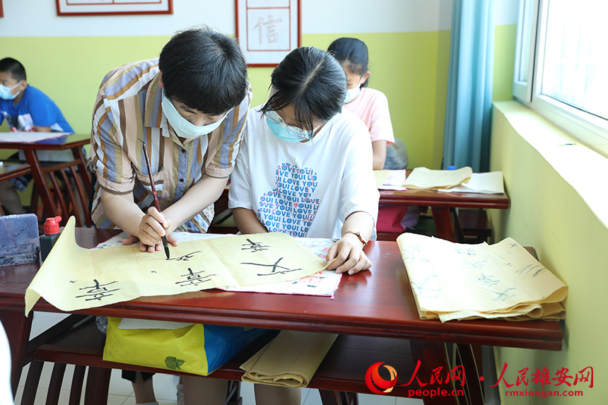 容城縣青少年活動中心內,老師正在教孩子寫書法。人民網 王紅攝