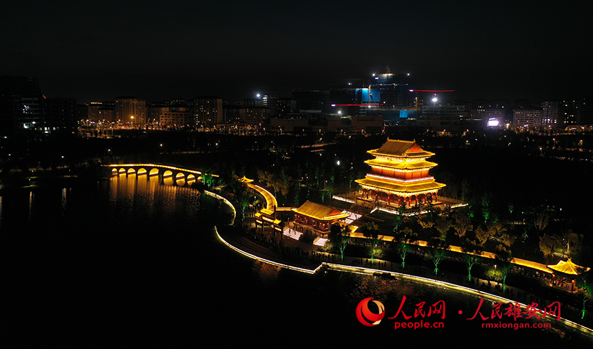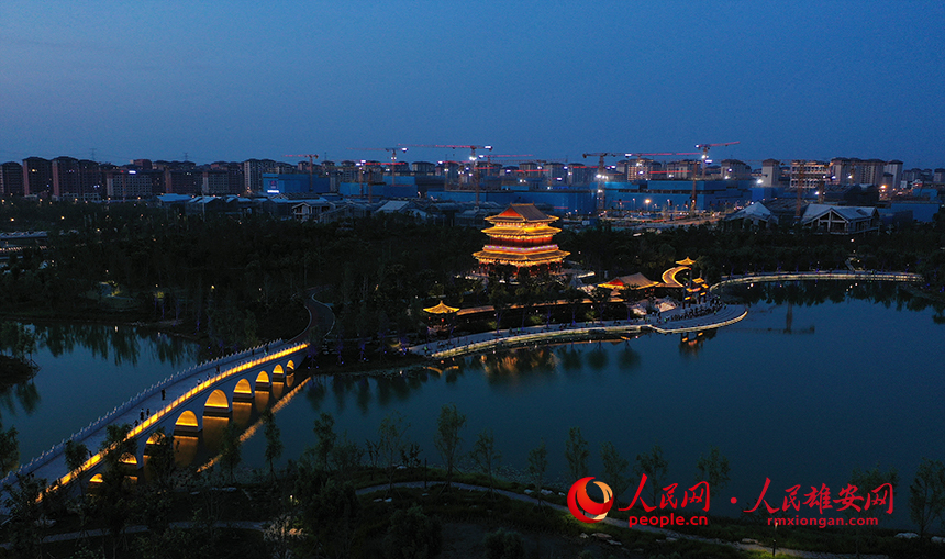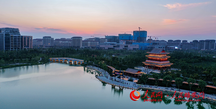 夕陽下的雄安金湖公園定安閣與迎曦橋(九孔橋)。人民網?李兆民攝