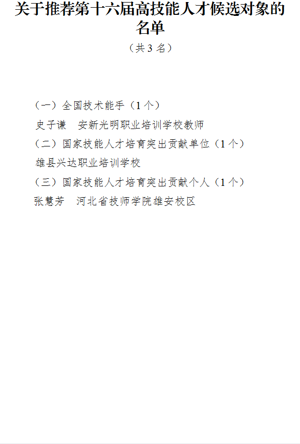 河北雄安新區管理委員會公共服務局關于推薦第十六屆高技能人才候選對象的公示