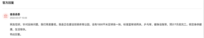 收到留言后,雄縣縣委回復,稱“我縣正在建設雙侯體育公園,設有1500平米足球場一塊,標準籃球場兩塊,乒乓球、健身設施等?!?/p>