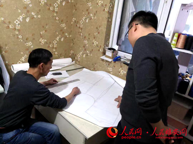 郭超凡(右)正在確定產品設計版型。受訪者供圖
