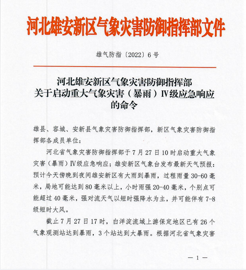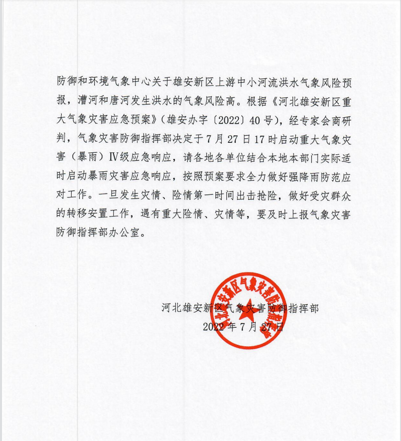 人民網雄安7月27日電 (何美萱)據雄安新區氣象臺發布的天氣預報,預計今天傍晚到夜間雄安有大雨到暴雨,過程雨量30毫米-60毫米,局地可能達到80毫米以上,小時雨強20毫米-40毫米,個別點可能超過40毫米,強對流天氣以短時強降水為主,并可能伴有7、8級短時大風。雄安新區氣象災害防御指揮部于7月27日17時啟動重大氣象災害(暴雨)Ⅳ級應急響應,請大家做好防范!