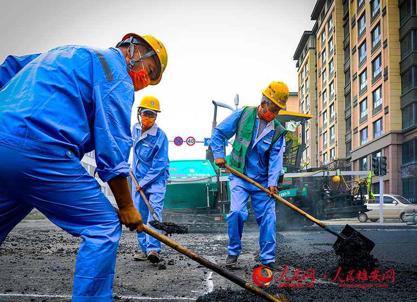 圖為工人正在進行瀝青攤鋪。人民網 宋燁文攝