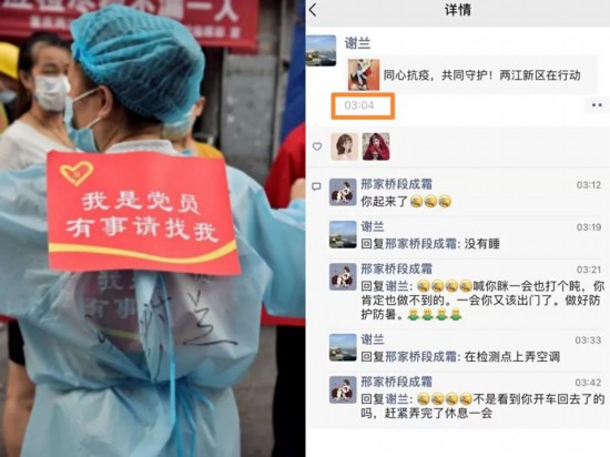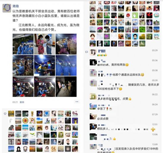 這條朋友圈,屬于網友“滟隱”,她來自教育系統。23日下午到24日,江北教育系統的黨員干部應急隊,第一時間趕到了區內各核酸采樣點,很多學校的教師志愿者也就近自愿奔赴,掃樓、錄入、現場引導……