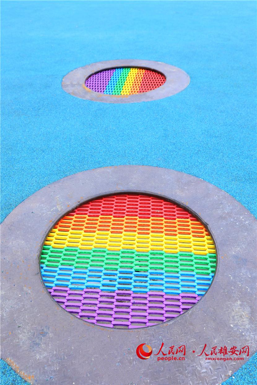 圖為雄安容和海棠幼兒園戶外活動場地內的蹦床。人民網 李兆民攝