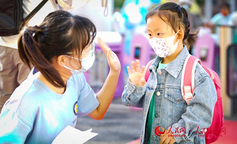 雄安容和海棠小學老師正在為入校學生測溫。人民網?李兆民攝