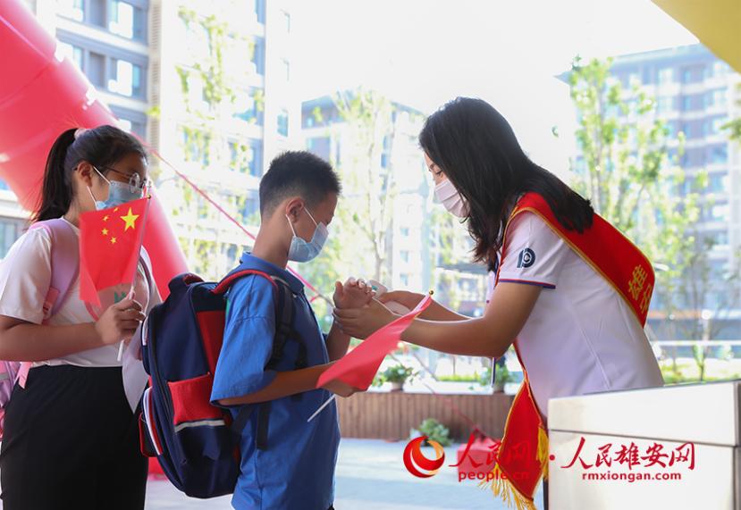 雄安容和海棠小學,孩子們手中揮舞著入學前愛國主義教育收到的國旗準備進入學校。人民網?李兆民攝