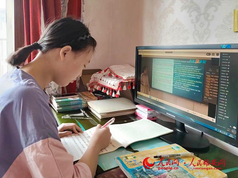 雄縣昝崗鎮中學學生在家上網課。雄縣教育局供圖