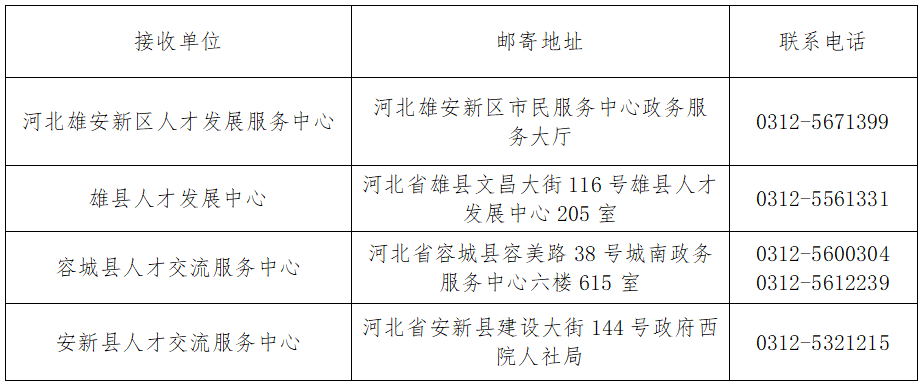 檔案接收單位包括河北雄安新區人才發展服務中心、雄縣人才發展中心、容城縣人才交流服務中心、安新縣人才交流服務中心。