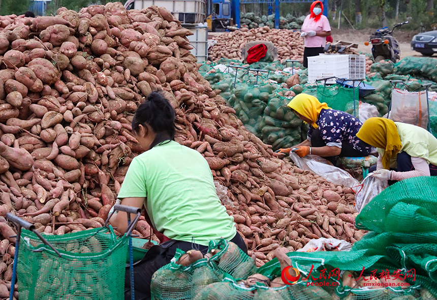 在雄縣雙堂鄉大魏莊,村民張一家門前堆滿了小山包一樣的甘薯,分揀、裝袋、稱重、裝車……一旁請來幫忙村民們忙得不亦樂乎。鄰居楊衛平家門前則填了好幾輛準備裝貨的大卡車,被清洗干凈的甘薯在這里分揀好打包,將被運往北京的商超。
