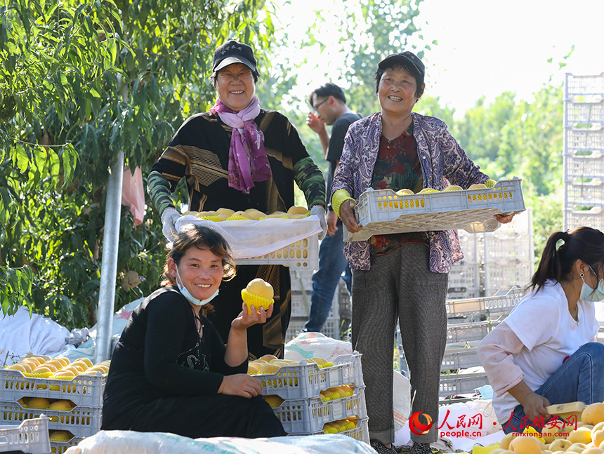 容城縣南張鎮北部的大片生態果林里,黃澄澄的蜜桃掛滿枝頭,村民正按照分工有序進行采摘、打包、裝箱。果園目前種植的果樹主要有桃樹、梨樹和蘋果樹,總面積超過1萬畝,今年收獲量已有3500多噸。